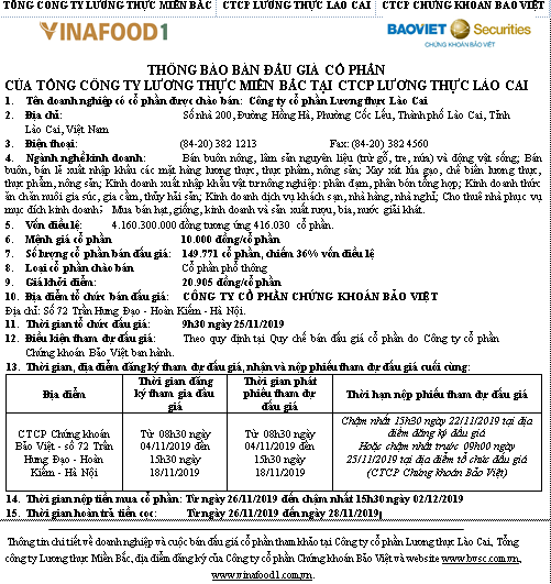 TCTLTMB: THÔNG BÁO BÁN ĐẤU GIÁ CỔ PHẦN CỦA TỔNG CÔNG TY LƯƠNG THỰC MIỀN BẮC TẠI CTCP LƯƠNG THỰC LÀO CAI