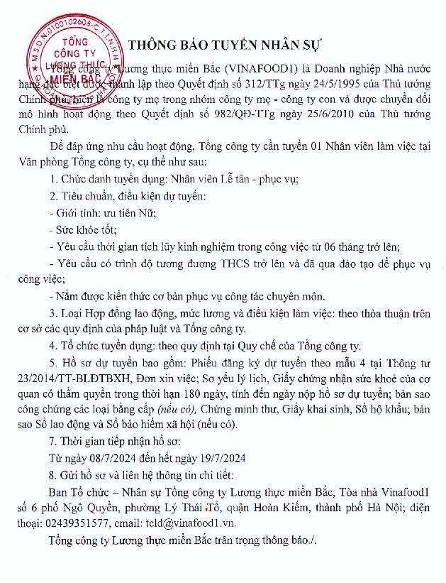 Tổng công ty Lương thực miền Bắc: Thông báo tuyển nhân sự